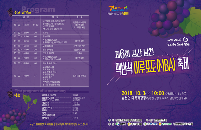 행사는 남천면 다목적광장 일원에서 오전 10시 식전 공연을 시작으로 개막식, 음악회 및 다채로운 전통문화공연과 함께 포도 수확 체험, 포도씨 뱉기, 포도 투호던지기 등 체험프로그램으로 진행될 예정이다.