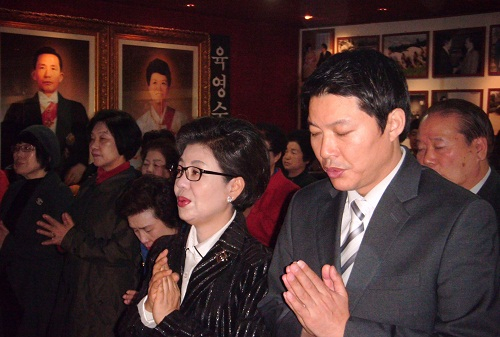 | ▲ 19일 경북 영주시 희수사추모관법당에서 거행된 故 육영수 영부인 85주기 탄신제전에서 박정희 전 대통령의 둘째딸 박근령 전 육영재단 이사장과 남편인 신동욱 박사가 합장하고 있다.ⓒ뉴시스 |