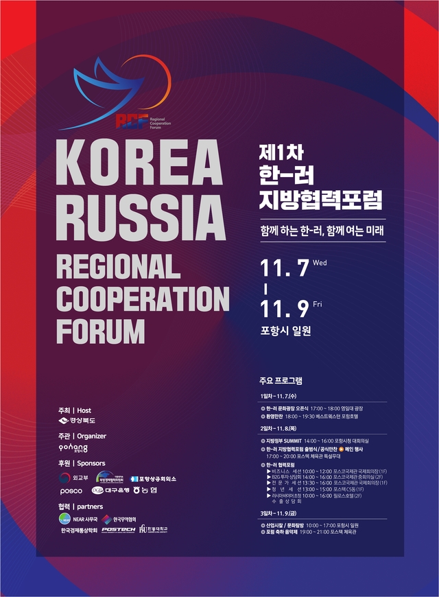지난해 9월 한-러 정상회담에서 두 정상이 합의하고 올 6월 정상회담에서 공식 발표한 ‘한-러 지방협력포럼’의 첫 행사인 '제1차 한-러 지방협력 포럼'이 7일~9일까지 경북 포항시에서 열린다.