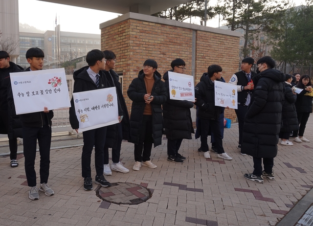 이날 가장 많은 응원부대가 모인 세종고등학교 1·2학년 학생들은 전날 전교회장과 학생회가 준비한 피켓에 “수능 잘 보고 꽃길만 걷자”, “긴장하지 말고 평소처럼만”, “잘 치고 잘 풀고 대학 잘 가자” 등 응원 메시지를 적어 선배들을 응원하며 일일이 손난로를 전달했다.