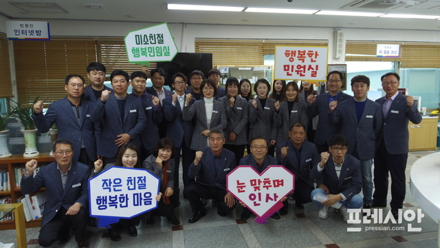 아울러 민원실 직원들은 매일 아침 8시 50분에 친절하게 민원인을 맞이하기 위해 친절교육을 실시해 공손한 모습으로 민원인을 응대하기 위한 친절인사로 활기찬 아침을 열고 있다.