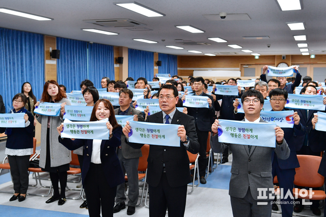 또한, 청렴 실천 결의 대회의 일환으로 홍보물을 활용한 청렴·친절 구호 제창 퍼포먼스를 통해 청렴한 생각과 친절한 행동으로 군민을 위해 봉사하고 신뢰받는 군정을 이루겠다는 의지를 표명했다.