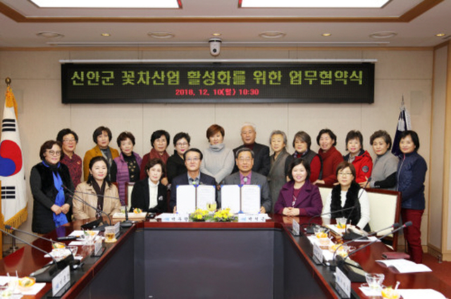 신안군수(박우량)와 한국꽃차협회 이사장(박석근) 외 관계자 50여명이 참석한 가운데 양기관은 협약을 통해 꽃차 산업화를 위한 전문인력 양성과정, 지역특산물 꽃차 제조기술 공동 개발, 꽃 가공관련 기술, 꽃차 블랜딩, 압화공예 등 적극적인 지원과 지속적인 재능기부를 하기로 했으며, 특히 협약식에서는 2019년 3월 지도 선도에서 개최되는 수선화섬 축제 성공을 기원하는 노란색 티 푸드와 꽃차(백목련)를 플레이팅하여 뜻깊은 자리를 더했다.