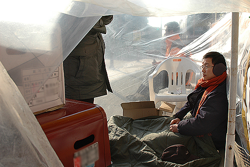 평소에는 두세 명이 조를 이뤄 교대로 자리를 지켰지만 이날 10명이 함께 모인 데는 이유가 있다. 홈플러스가 새롭게 들고나온 SSM 가맹점 1호를 29일 갈산에서 개장한다고 통보했기 때문. 그동안의 '전적'을 볼 때 새벽에라도 간판을 가린 천을 걷어내고 '도둑 개장'을 감행할 가능성이 크다고 여겼다.