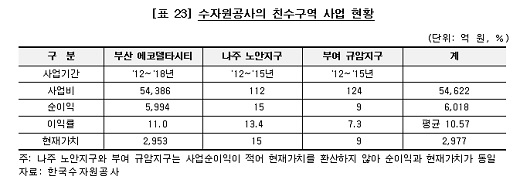 4대강 공사 때문에 8조 원의 빚을 떠안은 수자원공사(수공)가 이를 보전하기 위해 시행하고 있는 친수구역 개발 예상 수익이 총 3000억 원이 채 안 되는 것으로 감사원 감사 결과 확인됐다.