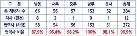 사망자 중 원청 소속 노동자는 16명(15%)인데 비해, 하청 소속 노동자는 93명(85%)에 달했고, 부상자 또한 원청 소속 노동자가 14명(11%)인데 비해 하청 소속 노동자는 113명(89%)에 달해 위험의 외주화가 심각한 수준임을 보여주고 있다.