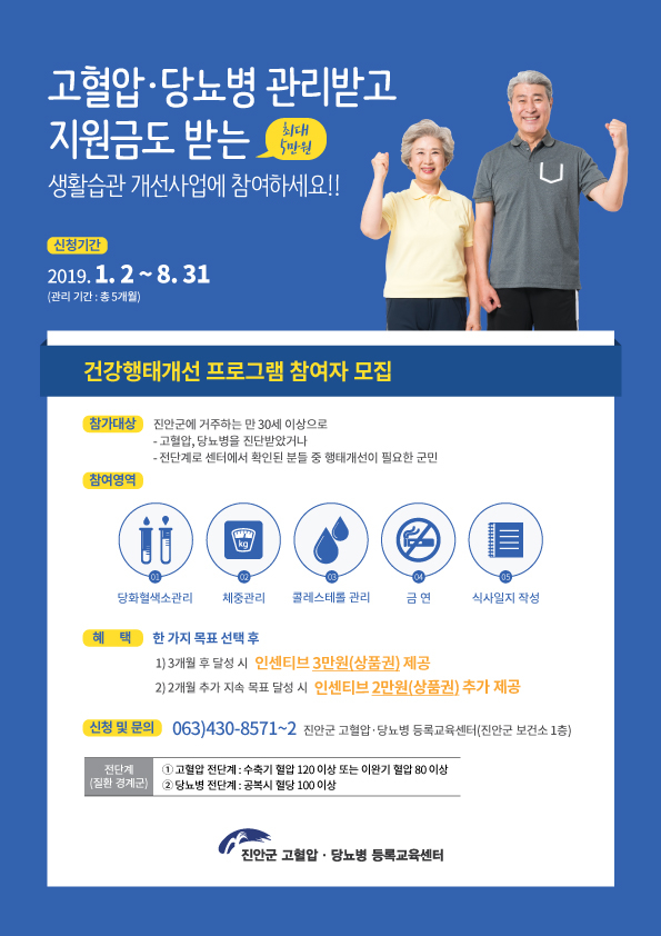 참여대상은 주민등록상 진안에 거주하는 만 30세 이상의 주민으로 고혈압‧당뇨병 진단을 받았거나, 고혈압·당뇨병 등록교육센터에서 고혈압‧당뇨병의 전 단계로 확인되어 건강행태개선이 필요한 주민이면 누구나 참여 가능하다.