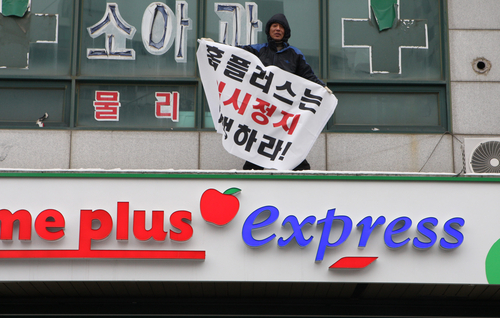 ▲ 17일 개점을 강행한 인천 부개동 홈플러스 익스프레스 부개점의 간판 위에서 부개동 대책위 소속의 한 상인이 농성을 벌이고 있다. ⓒ연합뉴스