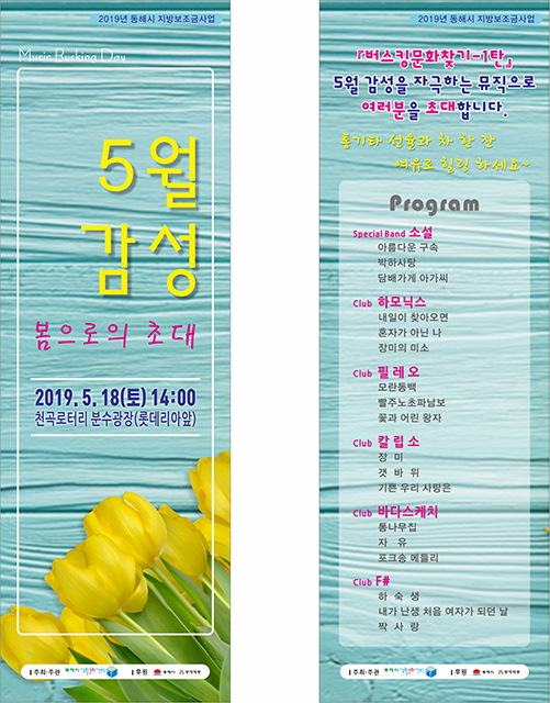 동해시(시장 심규언)가 오는 18일 오후 2시 시청로터리 분수광장에서 ‘5월 감성, 봄으로의 초대’라는 주제로 통기타 동아리의 거리공연을 개최한다고 밝혔다.