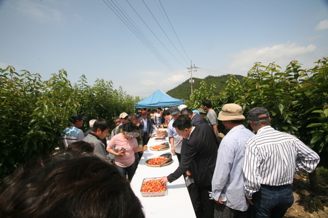 이날 첫 수확 평가회에는 체리 재배에 관심이 있는 농업인과 지역주민, 공무원 등 총 100여명이 참석해 체리원 포장조성 현황과 품종별 특성을 설명하는 시간을 가졌다.