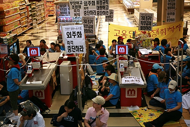 전국의 매장에서 비정규직 동료들을 지키기 위한 투쟁과 저항이 지속되었고, 그 분노는 비정규악법이 시행되기 딱 하루 전인 2007년 6월 30일에 터져 나왔다. 월드컵경기장에 위치한 홈에버 매장(현재는 홈플러스 월드컵몰점)을 점거하고 저항에 나선 것이다. 1주일 뒤에는 뉴코아 강남점의 킴스클럽 매장도 점거했다. 정규직·비정규직 노동자들 모두가 함께 말이다.