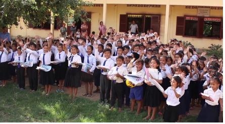 오는 7일 방송될 캄보디아 출신 결혼이주여성이 모교에 학용품을 전달하고 함께 촬영한 장면 ⓒFUN TV