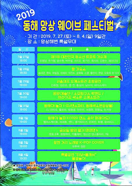 이지예 동해시 문화교육과장은 “청소년부터 중장년층, 지역 예술인의 무대부터 인기가수의 공연까지 다양한 세대와 계층을 만족시킬 수 있는 다채로운 프로그램이 가득한 ‘2019 동해 망상 웨이브 페스티벌’이 해변을 찾은 관광객들에게 한여름밤의 낭만을 선사할 것”이라고 말했다.