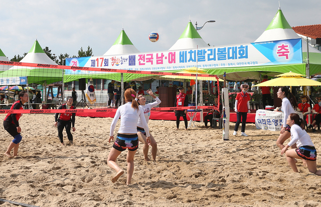 ▲지난 27일 강원 동해시 망상해수욕장 특설 경기장에서 ‘제17회 동트는 동해배 전국 남녀 비치발리볼대회’가 펼쳐지고 있다. 28일까지 열리는 이번 대회는 여자 42개팀, 남자 30개팀, 혼성 21개팀 총 93개팀 1000여 명의 선수단이 참여했다. ⓒ동해시