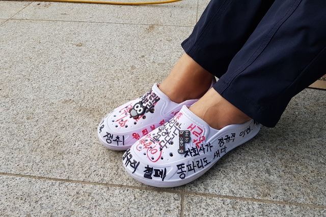 요금수납원의 한국도로공사 김천 본사 점거 12일 차인 20일, 농성장에서 만난 이미선(가명) 씨가 신은 하얀 실내화에는 요금수납원들의 바람을 담은 낙서가 가득했다. 현재 불법파견 1심에 계류 중인 이 씨는 농성 첫날부터 도로공사 본사에서 살고 있다.