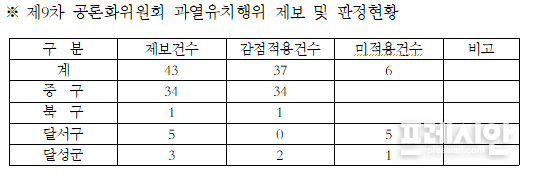 또한 제보 접수된 과열유치행위 해당여부에 대해 심도 있는 토론 과정을 거쳐 공정화고 객관적인 기준을 적용하여 상정된 43건(중구 34건, 북구 1건, 달서구 5건, 달성군 3건)에 대하여 심의․의결하였다.