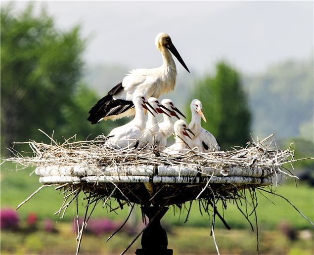 야생으로 방사된 ‘청출’이의 자손 ‘만황’이와 그 자손들 ⓒ한국교원대 황새생태연구원