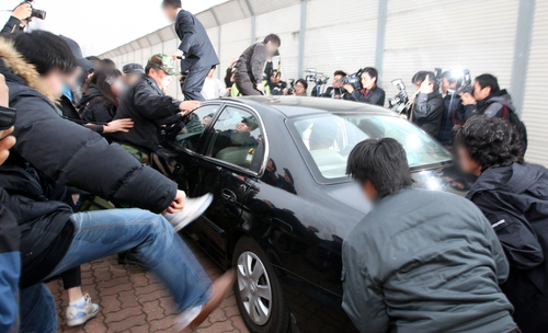 | ▲ 천안함 함장 최 중령이 사고 당시 상황 설명을 마치고 황급히 떠나려 하자 실종자 가족들이 이를 막고 분노를 터트리고 있다. ⓒ연합뉴스 |