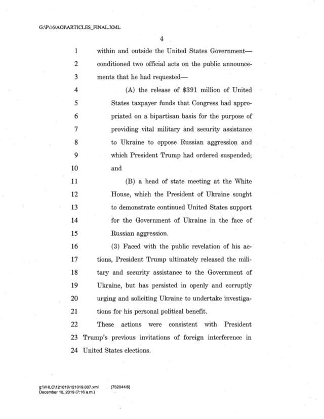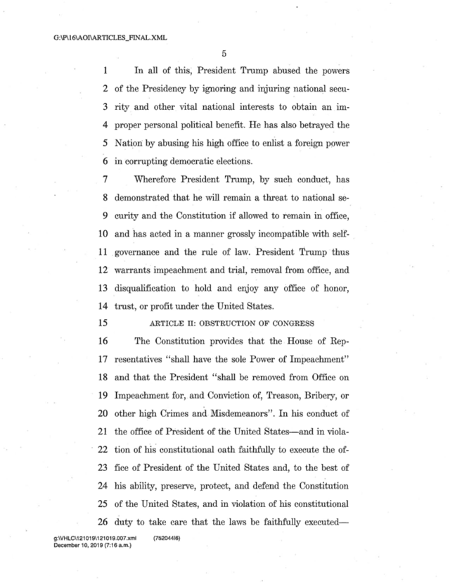 탄핵안은 "이 모든 면에서, 트럼프 대통령은 부적절한 개인적 정치적 이익을 얻기 위해 국가 안보와 다른 중대한 국가 이익을 무시하고 해함으로써 대통령의 권한을 남용했다"며 "그는 또한 자신의 높은 직책을 남용하여 민주주의 선거에 외국 세력을 끌어들이려 함으로써 국가를 배신했다"고 강조했다.