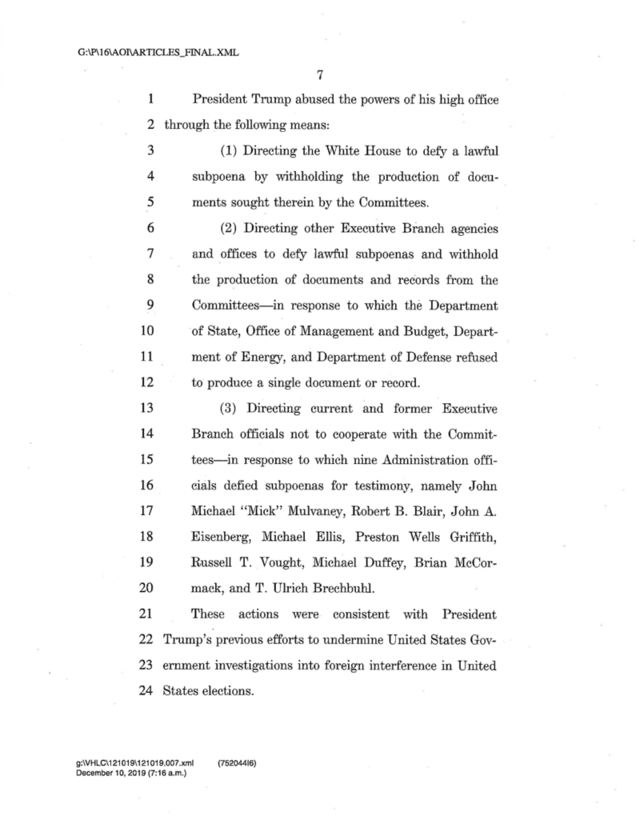 탄핵안은 "트럼프 대통령은 정당한 사유 없이 행정부, 백악관 등 공무원들에게 의회의 소환장을 준수하지 말라고 지시했다"며 "트럼프 대통령은 적법한 하원의 소집에 맞서 대통령 권한을 개입시켰고, 헌법이 부여한 하원의 '탄핵 소추권' 행사에 필요한 기능과 판단을 대통령이 내렸다"고 비판했다.