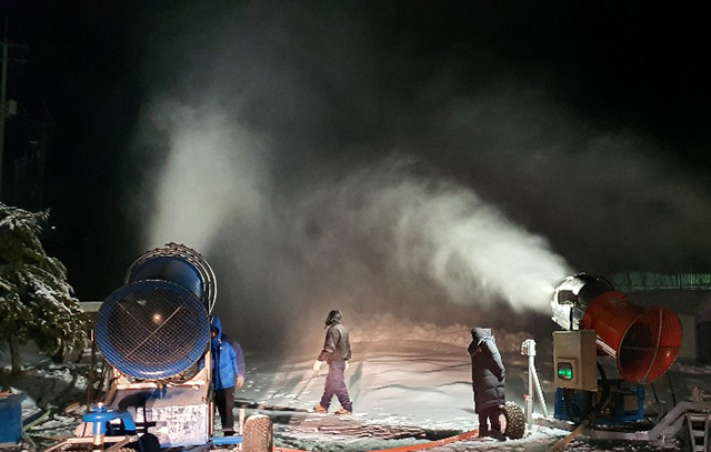 이 때문에 태백시는 눈축제 연기를 검토하다가 최근 최저 기온이 영하5~9도까지 떨어지면서 눈을 만드는 제설작업이 순조롭게 진행돼 지난 23일부터 하루 500톤 이상의 제설작업이 펼쳐지고 있다.