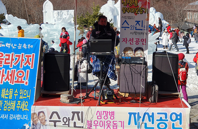 ▲제27회 태백산 눈축제 개막 3일째를 맞은 12일 태백산국립공원 눈조각 전시장 입구에 가수 ‘수와진’이 찾아 심장병 불우이웃돕기 공연을 펼쳐 관광객들에게 흥겨운 분위기를 만들고 있다. ⓒ프레시안(홍춘봉)