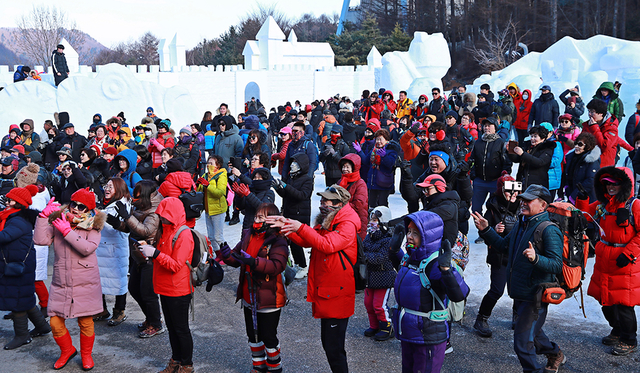 ▲제27회 태백산 눈축제 개막 3일째를 맞은 12일 태백산국립공원 당골광장에 마련된 특설무대에서 펼치는 음악에 맞춰 등반객과 관광객들이 즉석 댄스를 추며 즐거워하고 있다. ⓒ태백시