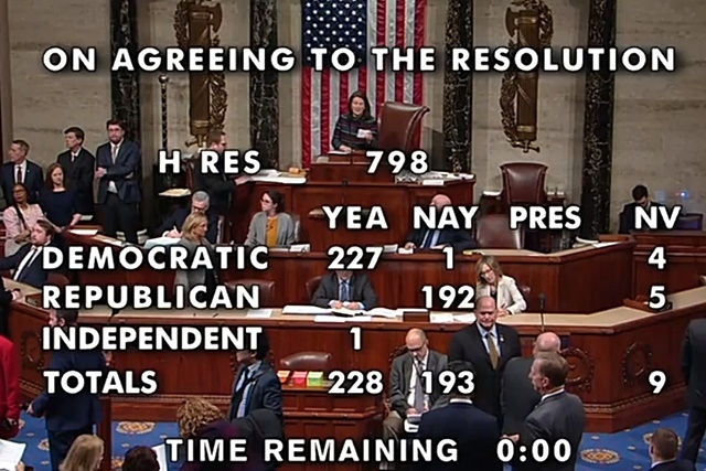 미국 하원은 이날 오전 전체회의를 열고 트럼프 대통령에게 적용된 2건의 탄핵소추안(권력남용과 의회 방해)을 상원으로 보내는 안건과 탄핵재판에서 '검사' 역할로 참여할 소추위원 7명 지명 안건에 대해 투표를 실시했다. 결과는 찬성 228표, 반대 193표로 가결됐다. 하원 재적 의석수는 431석(공석 4석) 중 민주당 233석, 공화당이 197석, 무소속이 1석이다. 정당 의석 분포수와 거의 동일한 표결 결과가 나왔다.