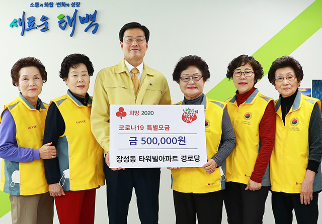 강원 태백시 장성동 타워빌아파트 경로당 노인자원봉사클럽(회장 김금순)은 16일 태백시청을 찾아 류태호 태백시장에게 코로나19 극복 성금 50만 원을 기탁했다.