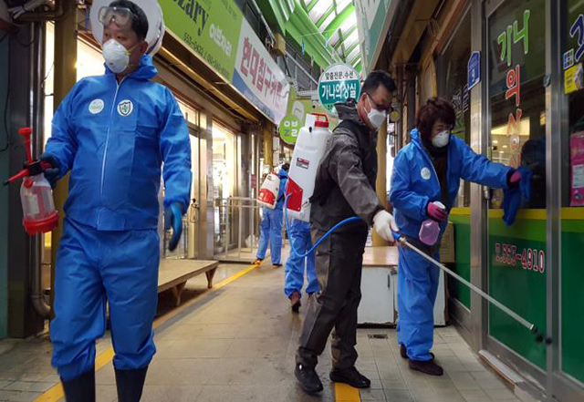 주민자율방역단 22명은 16일 11개조를 편성하고 황지자유시장과 중앙로 일대 상가에 동력용 분무기, 펌프식 분무기, 휴대용 분무기 등 장비 10여 대를 이용해 방역 활동을 펼쳤다.