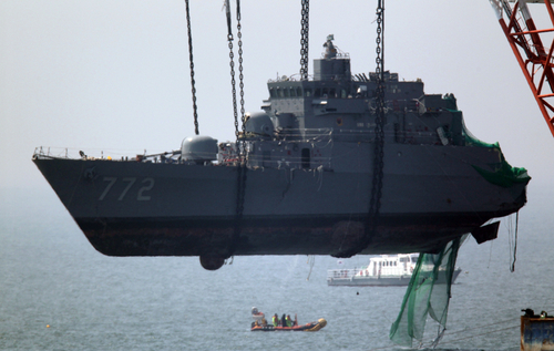 천안함의 '반쪽'이 24일 오후 12시 20분께 바지선에 탑재됐다. 천안함 함수는 바지선에 설치된 'U'자 모양의 거치대에 떠받쳐졌다.