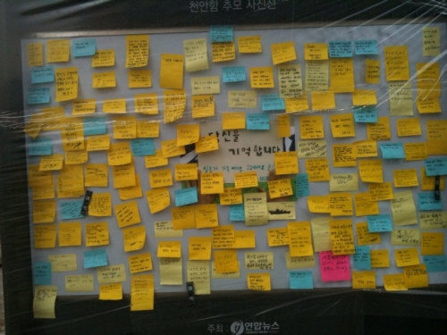 시민들은 분향을 마치고 나서도 좀처럼 발걸음을 옮기지 못했다. 그들은 분향소 옆 천막에 마련된 대형 합판 위에 갖가지 색깔의 종이에 메시지를 적어 붙였다. 한 언론사가 주최한 사진전의 작품 위에도 애도 글이 붙여졌다. 빗물 방지를 위해 두른 투명 비닐 위로 빗방울이 어려 "마치 글이 눈물을 흘리는 것 같다"고 지나가는 한 시민은 말했다.
