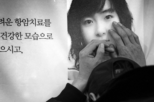 | ▲ 삼성전자 반도체 공장에서 일하다 백혈병에 걸려 지난 3월 31일 사망한 고 박지연 씨. 숨을 거둘 당시 박 씨의 나이는 불과 스물셋이었다. 유족이 박 씨의 '미니홈피'에 있던 사진을 인쇄한 현수막 앞에서 오열하고 있다. ⓒ이상엽 |