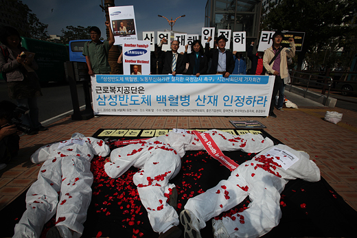 | ▲ 지난 달 서울 여의도 국민은행 앞에서 시민단체들이 '삼성 백혈병' 산재 인정 촉구 기자회견을 연 자리에서 숨진 백혈병 노동자를 상징하는 방진복을 입은 반올림 회원들이 쓰러져 있다. ⓒ프레시안(최형락) |
