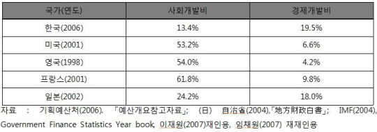 둘째, 토지불로소득의 사유화는 정부의 재정운용을 왜곡시킨다. 아래 〈표 2〉는 주요국가의 기능별 재정지출 현황 가운데 사회개발비와 경제개발비를 비교한 것인데 주요국가들과 비교했을 때 대한민국이 사회개발비에 비해서 경제개발비가 유일하게 높게 나타난다. 대표적 토건국가인 일본 정도만 경제개발비가 사회개발비의 75%수준에 달할 뿐이고 다른 주요 국가들은 정부 재정 지출 가운데 사회개발비의 비중이 경제개발비의 비중을 압도한다.