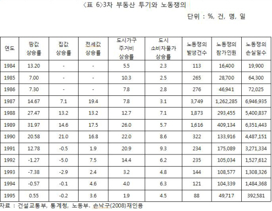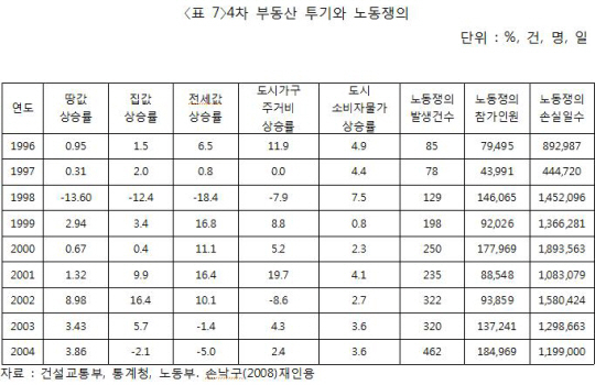 외환위기로 잠시 하락했던 부동산 가격은 2000년을 기점으로 땅값과 집값이 앞서거니 뒤서거니 하면서 다시 뛰어오르기 시작해 4차 부동산 투기 파동이 일었다. 소득 증대 외에 저금리와 이에 따른 월세 이율 하락(2001년 8월 1.31%→2004년 6월 1.05%)으로 이전에 비해 주거비 부담의 상승 정도는 약했지만 부동산 가격의 폭등은 이전 시기에 비해 노동쟁의 발생건수나 참가인원, 손실일수를 증가시킴으로써 2000년대 초 노동자들의 노동쟁의에 빼놓을 수 없는 배경으로 작용했다(손낙구2008). 〈표 7〉은 이런 사실을 보여준다.