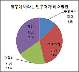 빈부격차 해소를 위해서는 최근 심각해지는 전월세난 해소 등 주택정책을 손질하는 게 필요하다는 응답이 많았다.