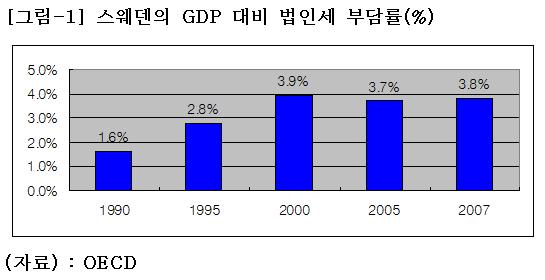 OECD에 따르면 1990년과 2000년 사이 스웨덴의 GDP 대비 법인세 부담률은 1.6%에서 3.9%로 2.4배나 증가했다. OECD 자료는 정 실장처럼 단순히 평균세율이나 최고세율에만 의존하여 조세분석을 하는 것이 얼마나 허구적인가를 잘 보여준다.