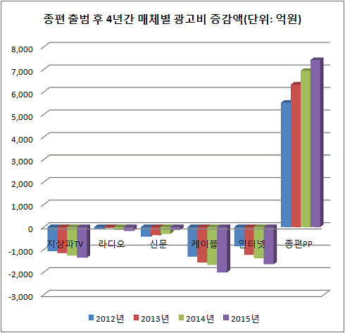 라디오와 신문도 종편 출범 이후 4년간 각각 연평균 110억 원, 304억 원의 광고매출 감소를 보이고, 인터넷은 연평균 광고매출 감소액이 1280억 원에 달할 것으로 코바코는 예측했다.