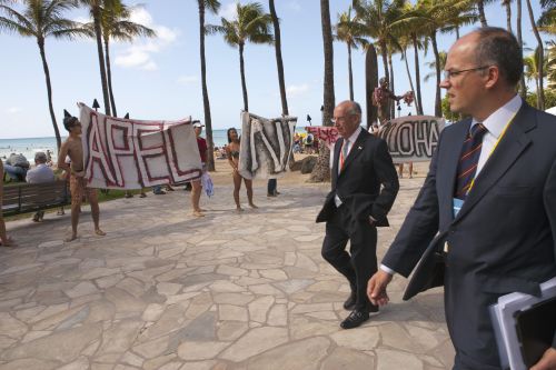 | 안팎으로 '월가 시위' 시달린 APEC 아시아태평양경제협력체(APEC) 정상회의가 열린 하와이에서도 월가 시위가 등장했다. 13일(현지시간) <AFP>에 따르면 400여 명의 시위대들이 "세계는 기다릴 수 없다"라고 외치며 반세계화 시위를 벌였다.