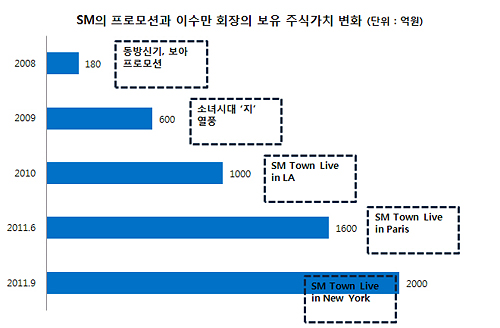더 흥미로운 것은 케이팝에 대한 호의적인 기사들이 기사 그 자체로 끝나지 않았다는 점이다. SM Town Live LA, 파리, 뉴욕 공연들이 있을 때마다 언론에서 쏟아낸 거의 동일한 찬양성 기사들이 노리는 최종 종착점은 바로 주식 커넥션이다. 일례로 이 공연들이 끝난 후 미디어의 집중 조명은 SM의 주식 가치를 높이는 데 결정적인 역할을 담당했다.