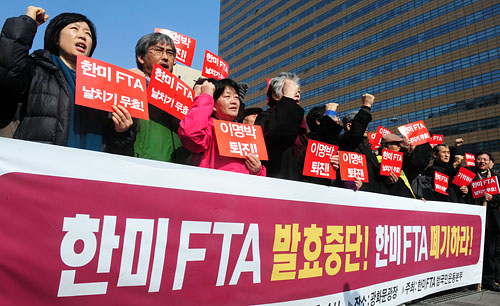 한편 한미 FTA 저지 범국본은 이날 오후 1시 광화문광장에서 기자회견을 열어 한미 FTA 폐기를 요구하고, 오는 25일 오후 5시 청계광장에서 범국민대회를 개최하겠다고 밝혔다. 민주통합당과 통합진보당도 국회에서 기자회견을 갖고 이날 집회를 통해 한미 FTA 반대입장을 다시 밝히기로 해, 총선을 앞둔 마당에 야권의 저항이 집중될 것으로 보인다.