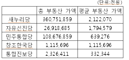 〈표2〉정당별 총, 평균 부동산 가액
