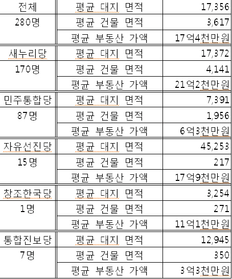 대한민국 국회의원들이 지닌 부동산이 얼마나 되는지는 아래 표를 보면 쉽게 알 수 있다. (자료 일자 : 2011년 3월 26일자, 자료 출처 : 국회공보_제2011-31호, 직계존비속 소유 부동산 제외, 공시가격 기준)