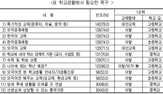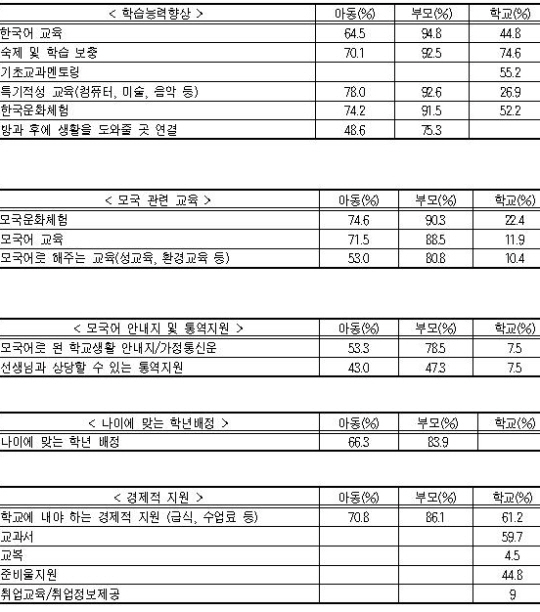 아동들의 경우 특기적성교육(컴퓨터, 미술, 음악 등)에 대한 욕구가 가장 많았는데, 그 중에서도 대안교육기관 재학중인 아동, 고등학교 재학 아동의 욕구가 더욱 많이 나타났다. 숙제 및 학습 보충욕구는 이탈한 아동들과 고등학교 재학 아동에게서 특히 많았다. 한국어 교육에 대해서는 이탈한 아동과 대안교육기관 재학아동이 엇비슷하게 압도적이었으며, 역시 고등학교 재학 아동에게서 많았다. 방과후 도움줄 곳 연결욕구에 대해서는 이탈한 아동과 중학교 재학 아동에게서 응답이 많았다. 한국문화체험에 대한 욕구는 이탈한 아동과 고등학교 재학 아동에게서 응답이 많았다.