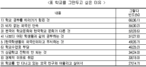 조사결과 학교를 그만두고 싶은 이유로 학교 공부를 따라가기 힘든 것(36.1%), 비자 없는 외국인 단속(30.2%), 본국의 학교문화와 한국학교 문화가 다른 것(28.6%), 나보다 어린 학생들과 같이 공부하는 것(27.8%), 한국학생들이 외국인이라고 무시하는 것(26.7%), 학교수업료 부담(25.2%), 상급학교 진학이 안 되는 것(24.0%), 경제적 이유로 취업(18.0%), 학교를 안 다니고 있는 모국 친구와 어울리고 싶어서(14.7%)의 순으로 응답하였다. 요약하면 학교공부와 외국인단속, 학교문화의 차이, 어린 학생과의 공부 등의 순이었다.