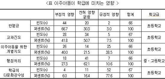 이주아동이 학급에 있을 때 부정적인 영향을 미치는 부분으로 '반평균'이 66.7%로 가장 많았고, '교과진도'에서 41.8%, '이주아동을 위한 개별지도'에서 40%의 순으로 많았다. '행정처리'에도 '부정적 영향'을 미친다는 응답이 27.3%나 되었다. 반면, 이주아동이 학급에 있을 때 긍정적인 영향을 준다는 부분은 '학급의 다문화감수성'이 77.6%로 가장 많았다. 즉, 이주아동이 학급에 있을 때 '학급의 다문화 감수성'은 높아지지만 '반평균'은 낮아지고 '교과진도'에 차질이 있기 때문에 전체적으로는 부정적인 영향을 미친다고 교사들은 보고 있었다.