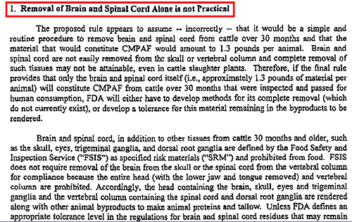 연구공동체 건강과대안이 전미렌더링협회(NRA)가 지난 2008년 1월 미국 식품의약국에 제출한 '사료 규제 강화조치에 관한 의견' 보고서를 입수해 밝힌 내용에 따르면, 미국 축산·사료업계 관계자들은 소에서 SRM을 완전히 적출해내는 건 불가능에 가깝다고 밝혔다.