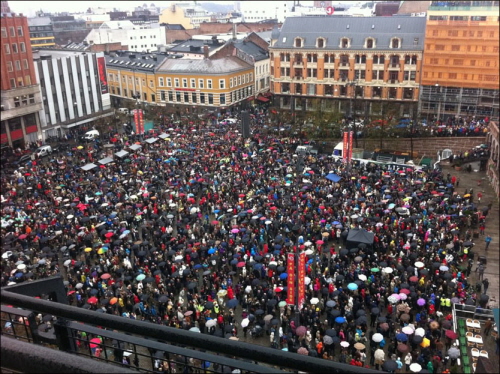 지난 4월 26일 오슬로의 영스토리겟(Youngstorget) 광장에서는 노르웨이에서 이례적으로 4만 명이 운집해서 희생자들을 추모하는 공연에 함께 했다. 한때 반전가요로 불리다가 지금은 노르웨이에서 널리 사랑받는 동요인 <무지개의 아이들>(Barn av Regnbuen)을 가수 릴레변 닐센(Lillebjørn Nilsen)과 함께 남녀노소가 따라 불렀다. 이 노래는 어린이들에게 마르크스주의적인 사상을 불온하게 불어넣는다며 브레이빅이 지목해서 반대하는 노래였다. 궂은비가 내리는 가운데서도 추모객들은 꽃을 들고 노래를 부르며 평화를 바랐다. 광장에 모여서 불행하게 숨진 사람들을 추억하며, 노르웨이가 세계에서 가장 안전한 나라이자 다민족주의를 지향하는 나라로 가는 도정이 멈추지 않기를 공유하는 것 같았다.