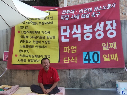 또한 전주대/비전대의 재단법인인 신동아학원은 최저임금도 받지 못했던 여성비정규직 청소노동자 1인에게 1일당 300만 원의 벌금을 학교에 내라는 업무방해금지 가처분을 냈습니다. 이는 조합원 전체 기준으로 1일 1억 원에 해당하는 금액이며, 총 43억 원이 넘는 금액입니다. 하지만 전주대도 비전대도 온리원도 수년 간 최저임금 인상분을 주지 않기 위해 부당하게 근무시간을 축소하여 여성비정규직 청소노동자들의 임금 4억 원을 체불한 것에 대해서는 단 한마디 사과도 하지 않고 있습니다. 단식농성 중인 이태식 지부장과 여성노동자들은 현재 신동아학원과 밀알복지재단 홍정길 이사장(전 남서울은혜교회 목사)에게 요구를 전달하기 위해 강남구 일원동 밀알교회(3호선 일원역 7번출구) 앞에서 노숙농성 중입니다. 밀알교회 측은 농성장 철거를 요구하고 있습니다. 많은 관심과 연대를 부탁드립니다. <필자>